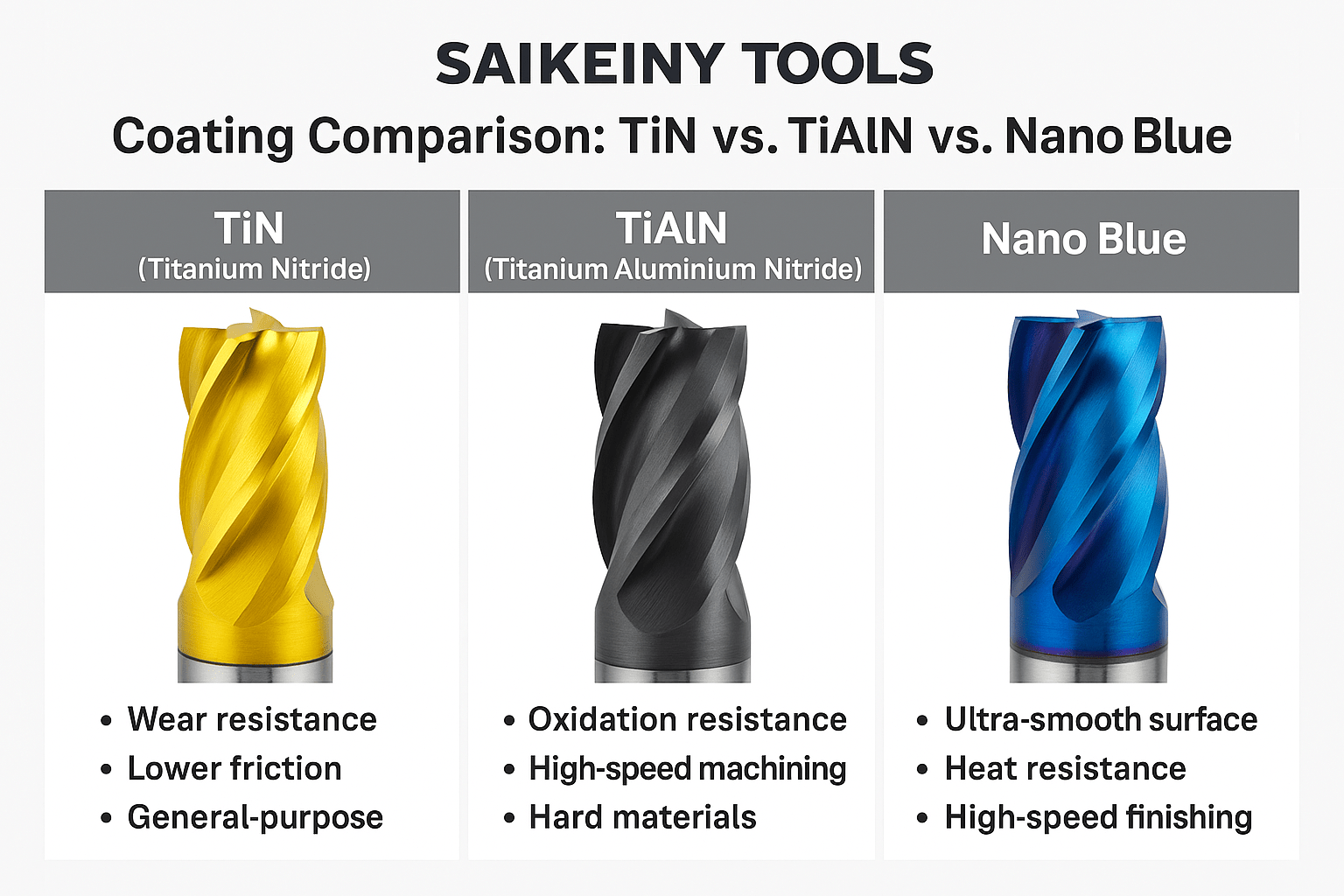 En Saikeiny Tools, entendemos que el revestimiento juega un papel fundamental en la longevidad de la herramienta, el rendimiento de corte y la resistencia al calor y el desgaste. Como fabricante de confianza y distribuidor global de herramientas de corte de alto rendimiento, ofrecemos una amplia gama de opciones de recubrimiento para nuestros fábricas finales, grifos, ejercicios y cortadores de chaflán, incluidos los recubrimientos azules de estaño, tialn y nano.